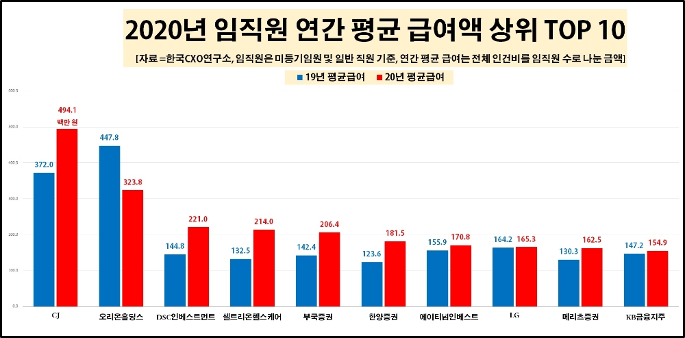▲CJ 4억9407만 원 ▲오리온홀딩스 3억2380만 원 ▲DSC인베스트먼트 2억2133만 원 ▲셀트리온헬스케어 2억1402만 원 ▲부국증권 2억641만 원 등 5개 기업은 임직원 연봉이 2억 원 넘었다.