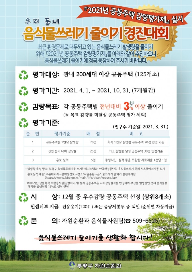 이미지 확대보기인천시 부평구(구청장 차준택)는 5일 지역 내 200가구 이상 공동주택 125곳을 대상으로 ‘공동주택 감량평가제’를 실시한다.