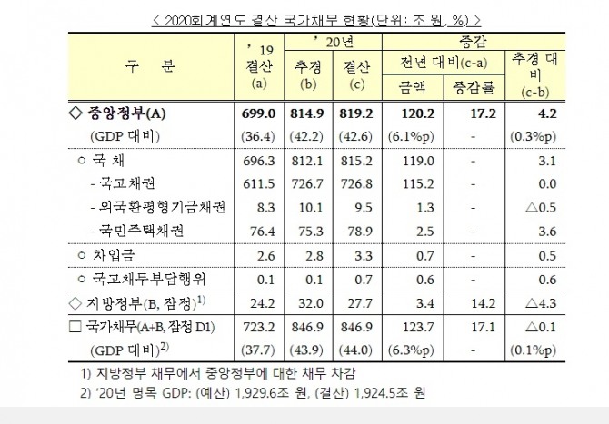 이미지 확대보기중앙·지방정부가 반드시 갚아야 할 국가채무는 846조9000억 원까지 불어났으며 실질적인 나라살림을 가늠할 수 있는 관리재정수지 적자 규모는 110조 원을 넘어 사상 최대를 기록했다.