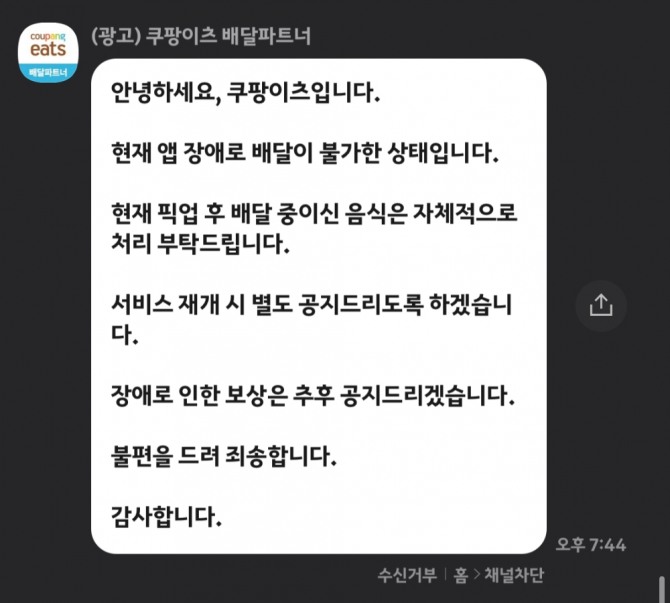 쿠팡이츠 측은 배달파트너 들에게 문자와 카카오톡을 통해 "현재 앱 장애로 배달이 불가한 상태로. 픽업후 배달 중인 음식은 자체적으로 처리"할 것을 요청한 상태다.