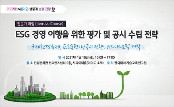 이미지 확대보기한국미래기술교육연구원은 오는 16일 서울 여의도 전경련회관에서 'ESG 경영 이행을 위한 평가 및 공시 수립 전략 전문가 과정'을 온․오프라인으로 개최한다.