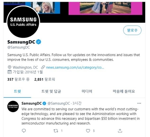 삼성전자의 이날 트윗은 화상회의에 참석한 기업들이 미국의 공격적인 반도체 투자 계획과 투자 동참 요구에 잇달아 메시지를 전달하는 가운데 나온 것이다.