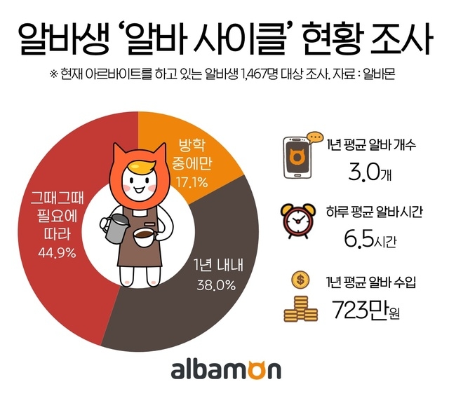 이미지 확대보기아르바이트 포털 알바몬이 16일 알바생 1467명을 대상으로 조사한 결과, 38%가 1년 내내 알바를 하는 ‘프로알바러’인 것으로 나타났다.