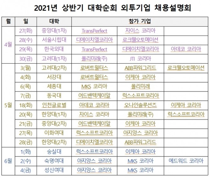 이미지 확대보기27일 중앙대에서 첫 설명회를 시작으로 오는 6월 4일까지 수도권 13개 대학에서 모두 16차례 채용설명회를 가질 예정이다.