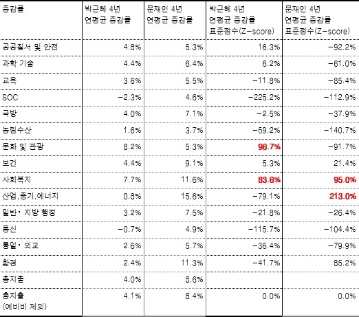 사회복지 분야는 두 정부 모두에서 제트값 증가율이 높았지만, 지출액 증대 비중은 박근혜 정부가 52%로 문재인 정부의 41.9%보다 컸다.