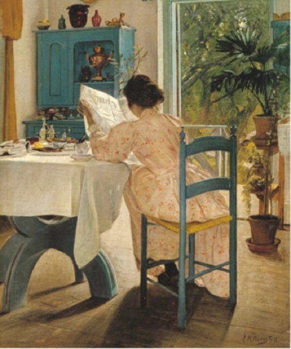 이에 대해 화가는 아내의 방을 캔버스에 유채로 담았다. 앞의 그림이 그것이다. 덴마크 화가 라우리츠 아네르센 링(Laurits Andersen Ring, 1746~1828)의 <아침 식사 중에>(1898년 作)를 보자. 그림 속 신문을 보는 핑크빛 원피스의 여인은 화가의 아내, ‘시그리드 쾰러’라고 한다. 이 그림에 우지현 작가는 자기 마음을 비추어 들이민 바 있다. 그림 설명이 재미도 있고 예리한 편이다. 그 일부를 여기에 소개한다.