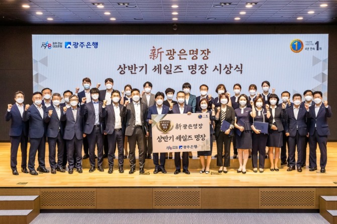 송종욱 광주은행장은 ‘新광은명장제도’ 상반기 세일즈명장으로 선정된 직원들을 시상하며 “무엇보다 ‘新광은명장제도’를 통해 직원간 부족한 것은 서로 채워주고, 많은 것은 함께 나누는 문화가 정착되길 바란다”며, “디지털금융 시대가 가속화되는 지금, 지속가능한 100년 은행으로 도약하기 위해서는 변화와 혁신으로 무장한 내실있는 질적성장이 필요하다. 그 변화의 중심에서 위기를 기회로 만드는 자신감과 열정으로 업무에 임해주길 바란다”고 당부했다.