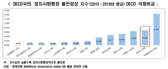 우리나라의 ‘정치·사회·행정 불안정성 지수’는 0.68인데 비해 주요 7개국(G7) 1위 캐나다는 0.16, OECD 1위 뉴질랜드는 0.01이었다.