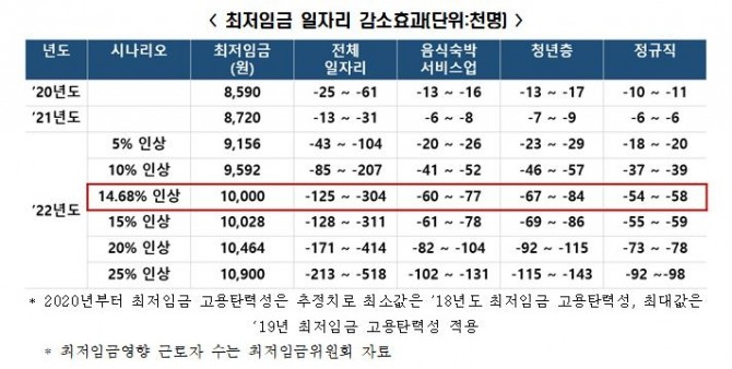 보고서는 최저임금 인상률 시나리오별로 일자리 감소 효과도 추정했다.