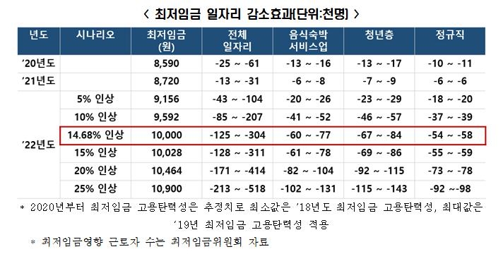 또 최저임금이 1만 원이 될 경우 최소 12만5000개에서 최대 30만4000개까지 감소할 것으로 추산했다.