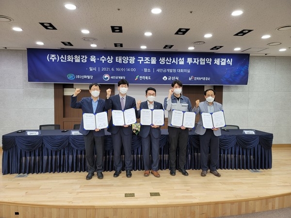이번 투자협약을 체결한 ㈜신화철강은 김제자유무역지역 내 소재한 철강 구조물 제조 기업으로 관계사인 케이스틸과 함께 새만금 육상태양광 3구역 100MW(6천톤) 구조물을 수주해 납품하고 있다.