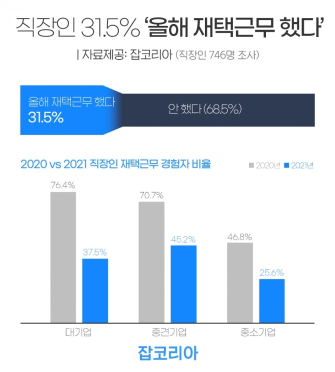 잡코리아가 지난 1월 직장인 839명을 대상으로 조사했을 때는 지난해 대기업 76.4%, 중견기업 70.7%, 중소기업 직장인 중은 46.8%가 재택근무를 한 것으로 분석됐었다.