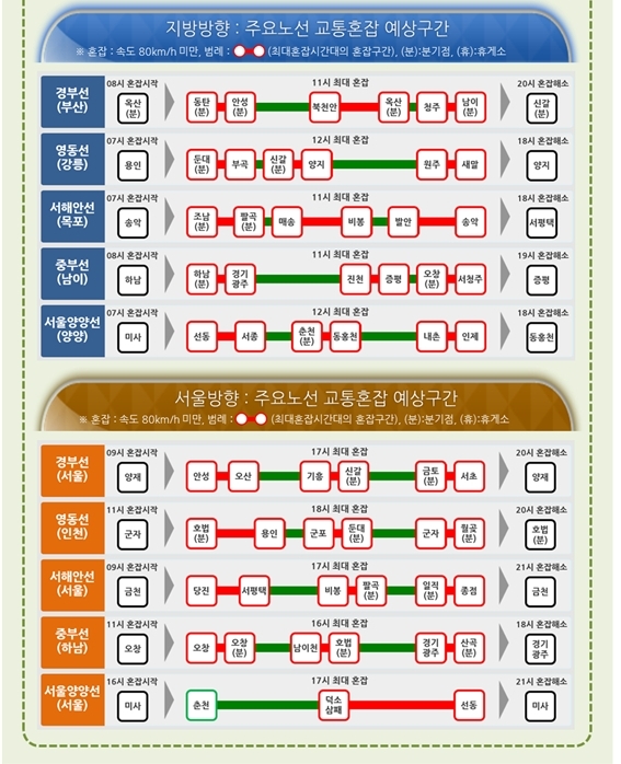 일요일 서울 방향으로는 ▲대전~서울 1시간30분 ▲부산~서울 4시간40분 ▲광주~서울 3시간20분 ▲목포~서서울 3시간40분 ▲강릉~서울 2시간40분 ▲양양~남양주 1시간50분 등이다.