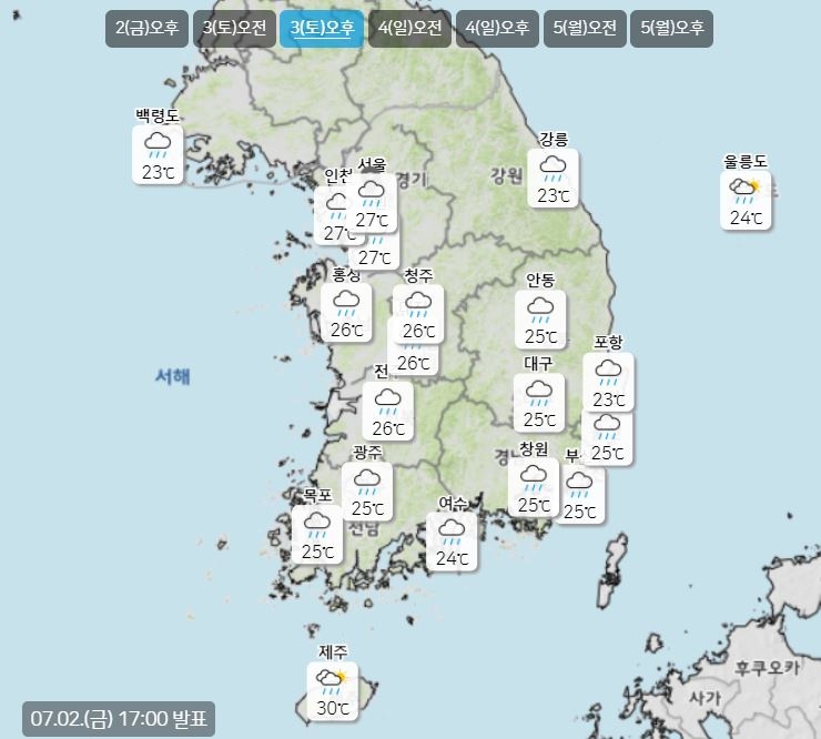 낮 최고 기온은 ▲서울 27도▲인천 27도▲수원 27도▲춘천 26도▲강릉 23도▲청주 26도▲대전 26도▲전주 26도▲광주 25도▲대구 25도▲부산 25도▲제주 30도이다.