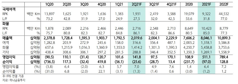 박 연구원은 "올해 내내 화물부문 호조를 통해 양호한 영업실적 달성이 예상되는 가운데 2022년에는 국제선 수요 회복도 기대되기 때문에 영업실적 개선세가 지속될 것"이라고 내다봤다.