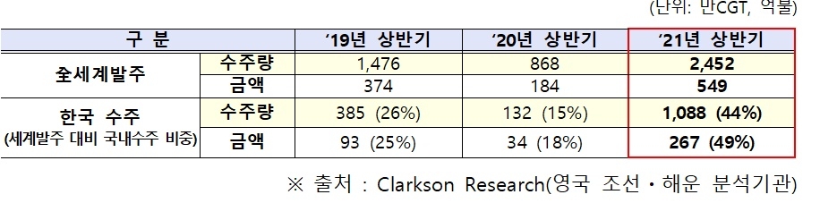 신종코로나바이러스감염증(코로나19) 사태 발생 이전인 2019년과 비교해서도 183% 늘어난 것으로, 조선업계 호황기인 2006~2008년 이후 13년 만에 달성한 상반기 최대 실적이라고 산업부는 평가했다.
