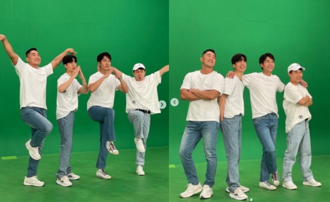 사진은 이승기가 SBS 예능프로그램 '집사부일체' 멤버들과 함께 촬영하고 있는 모습이다. 이승기는 양세형, 김동현, 유수빈과 함께 포즈를 취하며, 환하게 웃고 있다. 이번에 새롭게 '집사부일체'에 합류한 유수빈을 환영하는 뜻으로 풀이된다.