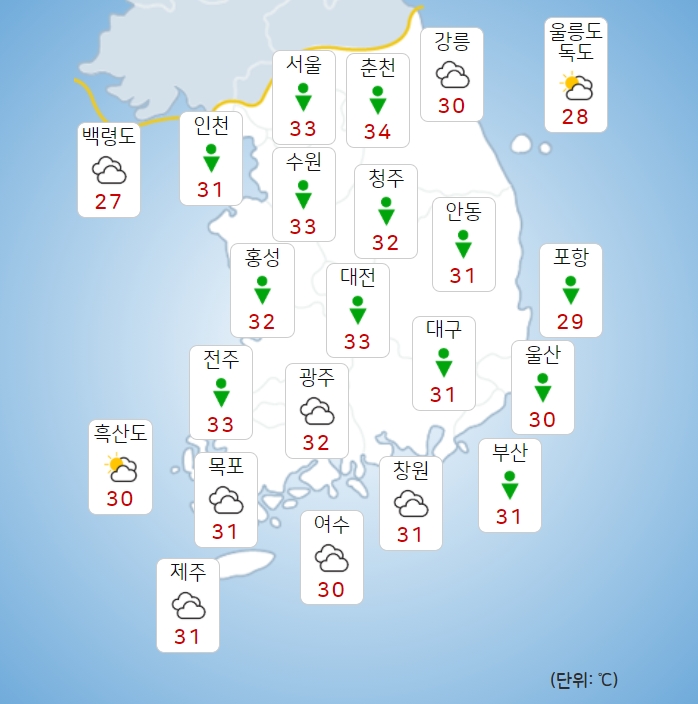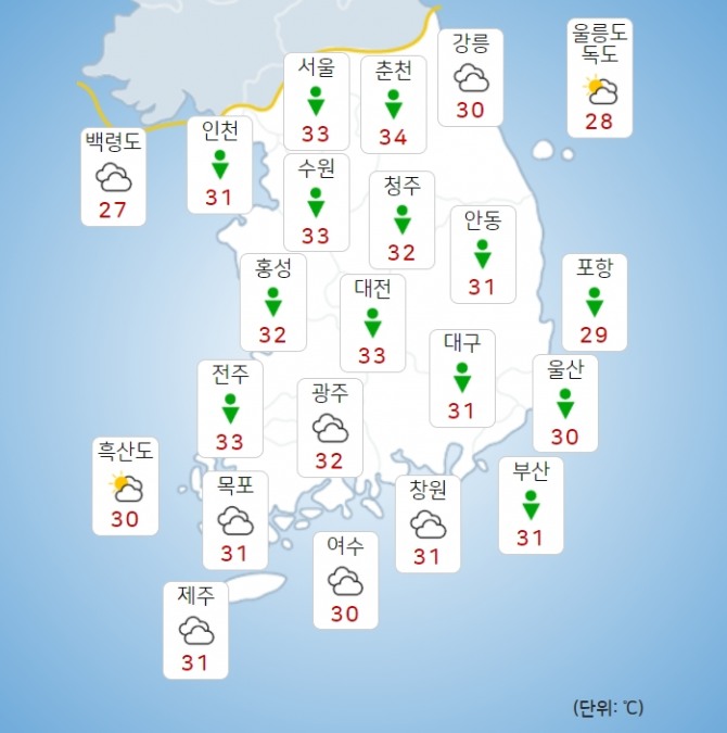 전국 주요도시별 아침 최저기온은 서울 25도, 대구 23도, 춘천과 강릉, 대전, 청주, 전주, 광주 24도, 부산 23도로 전망됐다. 낮 최고기온은 서울 33도, 강릉과 부산 30도, 대구와 광주 31도, 청주와 전주 32도, 춘천과 33도로 예보됐다.
