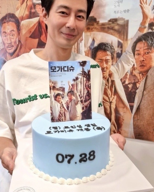 공개된 사진에서 조인성은 생일 케이크를 들고 인증 사진을 찍고 있는 모습이다. 생일 케이크에는 '조인성 생일 모가디슈 개봉 (축)'이라는 글이 새겨져 있다.