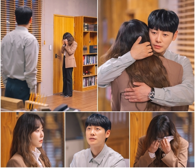 두 손으로 얼굴을 가린 채 울던 강다정이 결국 가슴 아픈 통곡을 하자, 주영도가 조용히 다가가 품에 안으며 토닥인다. 강다정이 오열하게 된 이유는 무엇인지 눈길을 끈다.