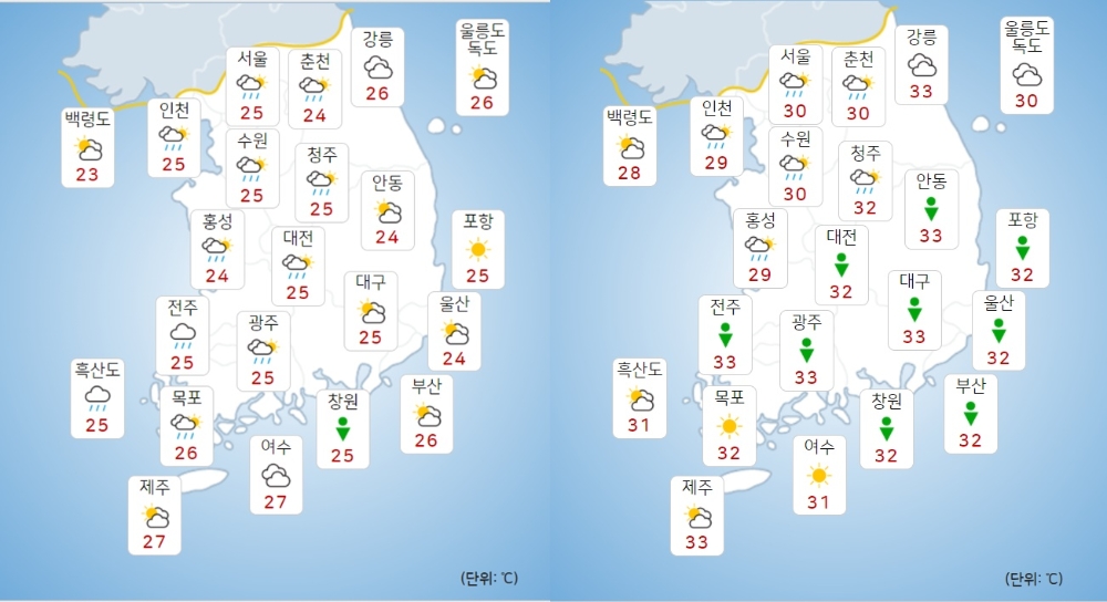 아침 최저기온은 23∼27도, 낮 최고기온은 30∼34도의 분포를 보이겠다. 비가 내리면서 일부 지역은 기온이 내려가겠지만, 습도가 높아 체감온도는 대부분 지역에서 33도 이상으로 오르겠다.