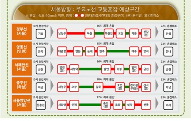 서울방향으로는 10~11시부터 정체가 시작돼 16~17시 최대, 22~23시쯤 해소된다.