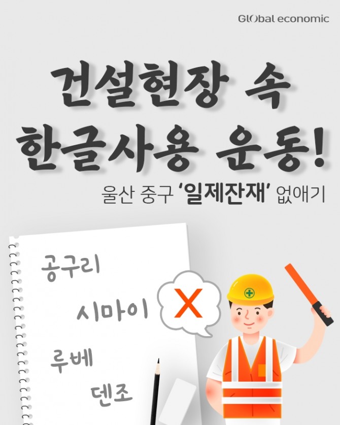 한편 울산시 중구는 지난 5월 '한글도시 울산 중구' 선포식 이후 한글 도시로 거듭나기 위한 사업의 일환으로 건설 현장에서 쓰이는 일본어 투 용어를 우리말로 개선하는 운동을 벌이고 있습니다.