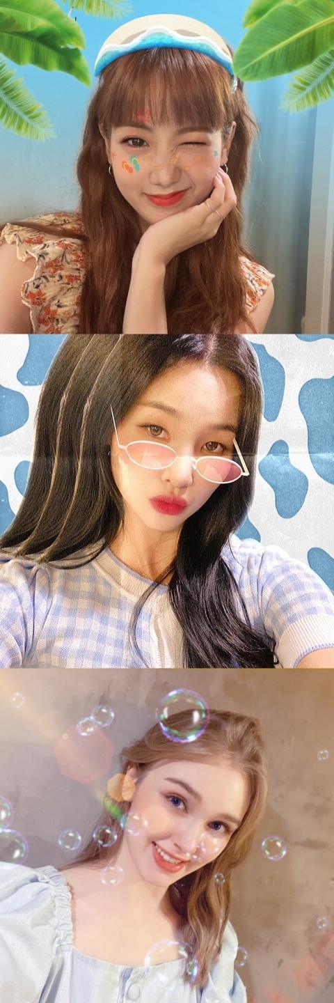 사진 속 강혜연은 깜찍한 윙크와 얼굴 위 알록달록한 타투 필터로 밝은 에너지를 발산했다. 황우림은 핑크 선글라스 필터를 통해 청순한 비주얼을 과시했다. 마리아는 투명한 비눗방울 필터 속에서 사랑스러운 미소로 시선을 사로잡았다.