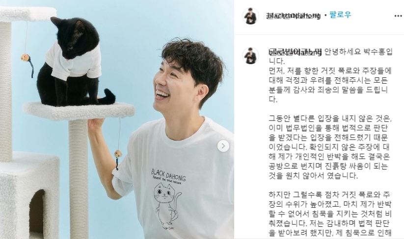 이미지 확대보기박수홍은 19일 자신의 인스타그램을 통해 "저를 향한 거짓 폭로와 주장들에 대해 걱정과 우려를 전해주시는 모든 분들께 감사와 죄송의 말씀을 드린다"며 말문을 연 뒤 "그동안 별다른 입장을 내지 않은 것은, 이미 법무법인을 통해 법적으로 판단을 받겠다는 입장을 전해드렸기 때문이었다. 확인되지 않은 주장에 대해 제가 개인적인 반박을 해도 결국은 공방으로 번지며 진흙탕 싸움이 되는 것을 원치 않아서였다"고 설명했다.