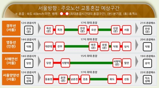 서울방향으로는 11~12시부터 정체가 시작돼 17~18시 최대, 21~22시쯤 해소된다.