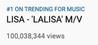 이미지 확대보기지난 10일 오후 1시 타이틀곡 'Lalisa'로 솔로로 데뷔한 리사는 약 2틀만인 12일 오후 2시 5분경 유튜브 뮤직비디오 조회수 1억 뷰를 돌파했다고 미국 연예매체 숨피(Soompi)가 이날 보도했다.