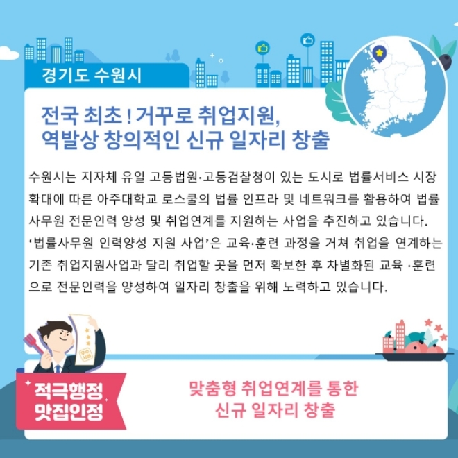 최종진 수원시 일자리정책과장은 “수원시는 기초지방자치단체 중 유일하게 고등법원·검찰청, 가정법원이 있는 도시로 법률사무원 수요가 많다”며 “수원시 지역 특성에 맞는 맞춤형 일자리를 지속해서 발굴하고 양질의 일자리 창출을 위해 노력하겠다”고 말했다.