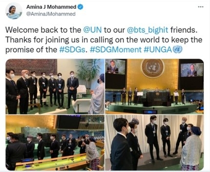 아미나 모하메드 유엔 사무부총장은 20일 미국 유엔본부 총회장에서 열린 지속가능발전목표 고위급회의(SDG 모멘트) 개회식에 참석한 BTS를 환영하는 글을 올렸다.