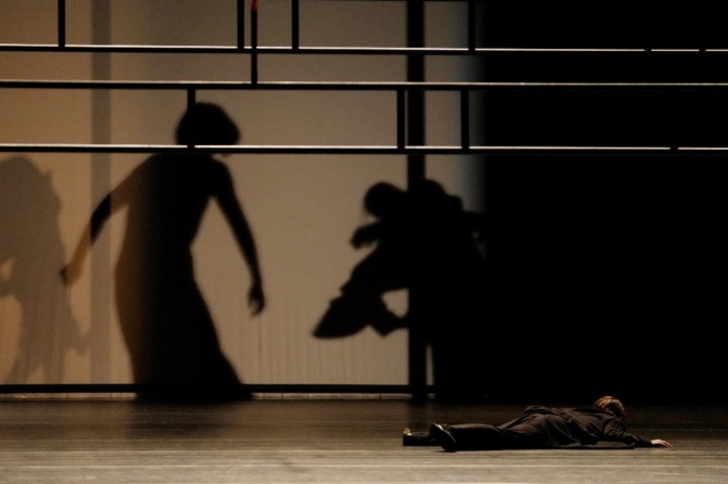이미지 확대보기전자음(音)이 현대의 넓은 공간에 퍼지고 버버리 코트의 남자가 앞으로 전개될 내용의 이야기를 써내려가는 듯하다. 집의 실내를 상징하는 여자들의 언더웨어 같은 가벼운 옷차림이 호기심을 끈다. 남자는 무대에 걸터앉아 객석을 내려보거나 여인을 지켜보면서 <베를린 천사의 시>의 다니엘을 연상시키는 행위를 지속한다. 붉은 문과 벌이는 남자의 움직임이 무리를 불러오고 신체 부분별 움직임과 호흡, 가면이 작동되고, 집 상징의 구조물이 눕고 서고 회전한다.