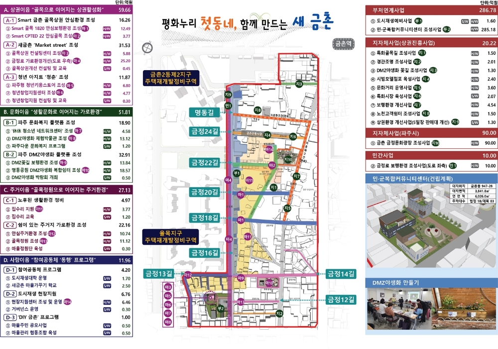 따라서 시는 2022년부터 2025년까지 ▲골목으로 이어지는 상권활성화 사업 ▲생활문화로 이어지는 가로환경 사업 ▲골목정원으로 이어지는 주거환경 사업 ▲참여공동체 동행 프로그램 등을 추진해 금촌1동 중심시가지에 활력을 불어 넣을 방침이다. 보행환경을 개선하고 골목정원을 조성하며, 상권활성화 및 청년창업 지원을 위한 컨설팅 센터, 문화복지 플랫폼 청소년네트워크 센터, DMZ야생화 체험박물관 등의 거점시설을 조성해 ‘도시재생’을 구현한다는 계획이다.