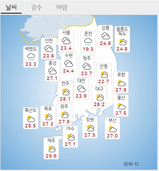 낮 최고 기온은 서울 24도, 인천 25도, 수원 26도, 춘천 24도, 강릉 27도, 청주 28도, 대전 28도, 전주 30도, 광주 30도, 대구 28도, 부산 28도, 제주 30도다.