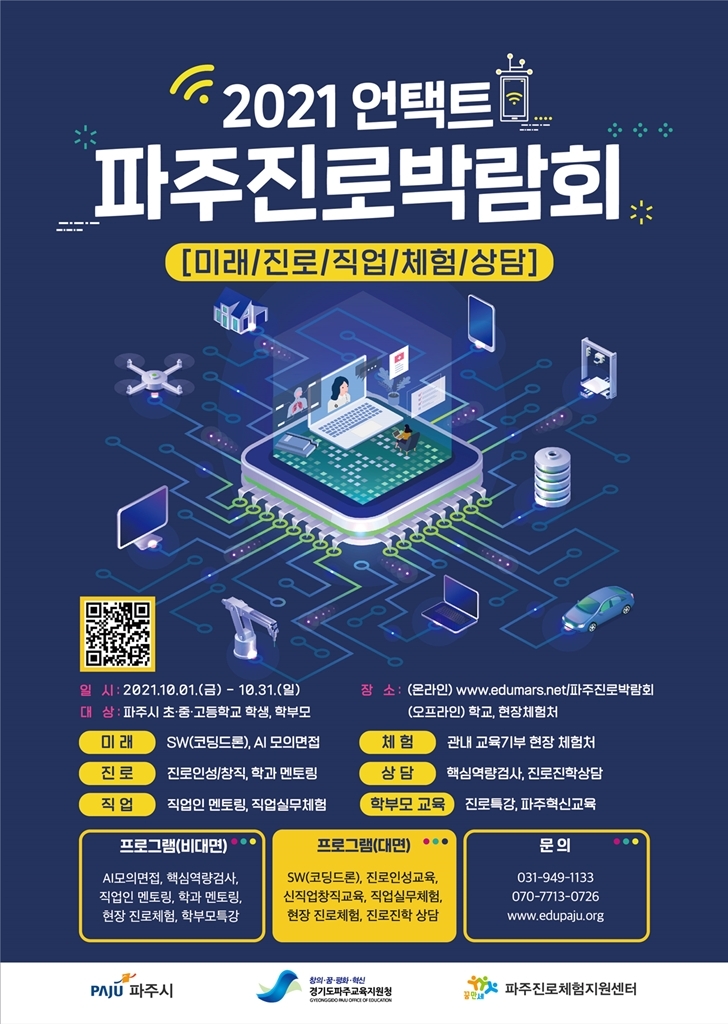 최종환 파주시장은 “코로나19 장기화로 비대면 진로박람회를 개최할 수밖에 없는 현실이 안타깝지만, 파주의 모든 학생들이 차별 없는 진로교육을 통해 자신의 진로를 구체화하고 스스로 꿈을 이루어 나갈 역량을 키우는 소중한 시간이 되기를 바란다”고 말했다.