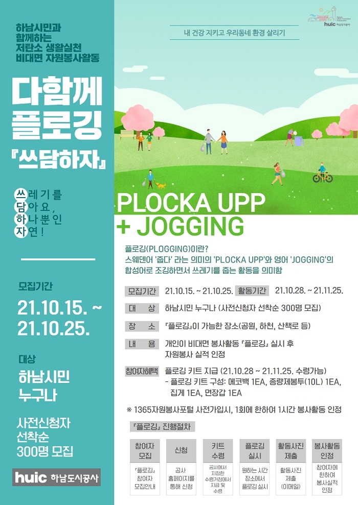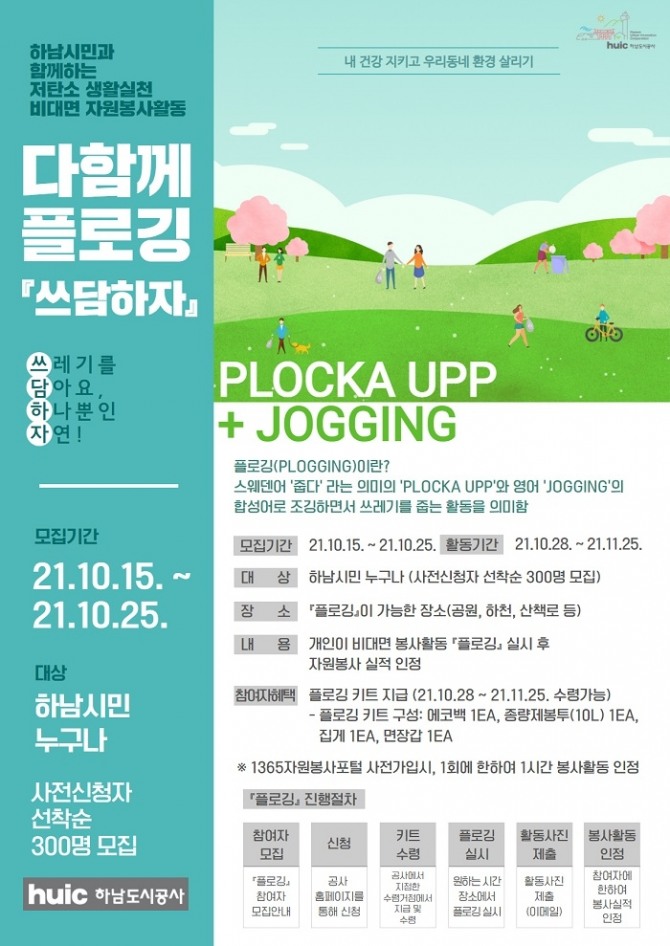 이번 캠페인은 하남시민이면 누구나 참여가 가능하며, 지난15일부터 25일까지 11일간 하남도시공사 홈페이지를 통해 사전신청자(300명)를 모집하고, 원활한 플로깅을 위한 플로깅 키트(에코백, 집게, 면장갑, 쓰레기종량제봉투(10ℓ), 마스크)도 제공될 예정이다.