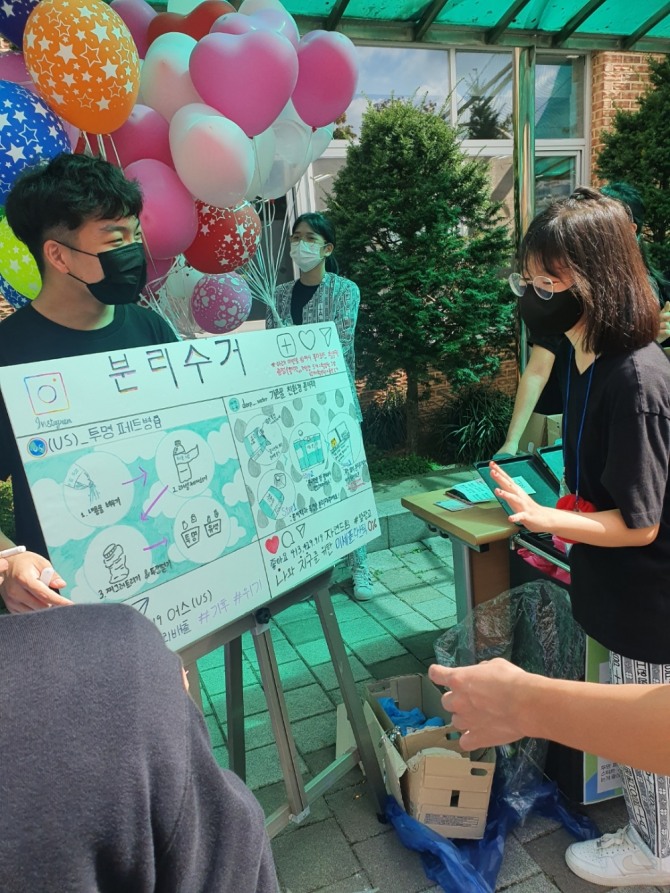 특히 지난 14일 교내 운동회 때 환경동아리(US, 글로벌 리더쉽) 학생들이 주축을 이뤄 종이팩 재활용 캠페인 부스를 운영했다. 학생들 스스로 탄소중립 실천 방안에 대해 생각하고 실천하는 등 의미 있는 시간을 가졌다.