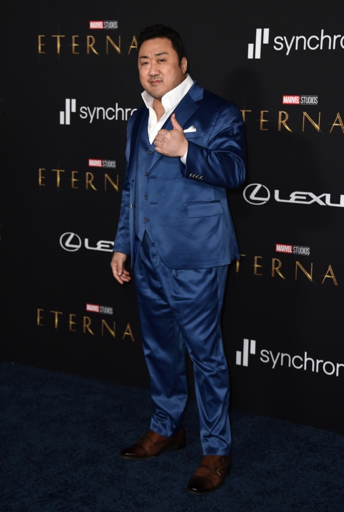 이날 마동석은 짙은 블루 톤의 수트를 입고 레드카펫을 밟았다. 미국 이름 '돈 리'로 소개된 마동석은 자신이 연기한 길가메시에 대해 "이터널스에서 가장 강력하고 힘이 센 캐릭터이면서 동시에 따뜻한 마음을 가진 인물"이라고 소개했다.