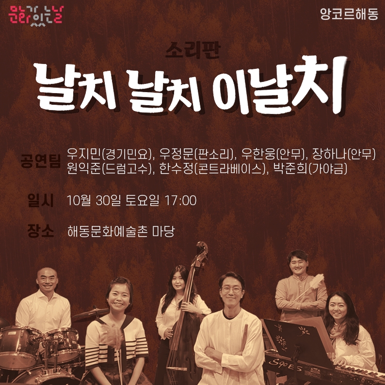 문화가 있는 날 ‘앙코르 해동’ 공연은 12월까지 매 달 마지막 주 토요일에 진행되며, 지역민과 담양을 찾는 방문객에게 지친 일상을 위로하며 온가족이 함께 즐길 수 있는 공연을 선보이고 있다.