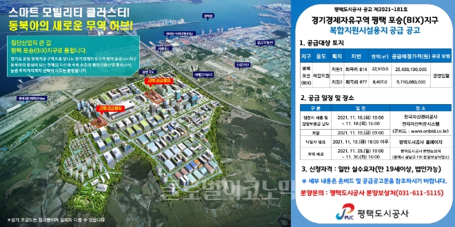 이미지 확대보기경기 평택도시공사(사장 김재수)는 경기경제자유구역 평택 포승(BIX)지구 내 복합지원시설용지 2필지를 공급한다고 8일 밝혔다.