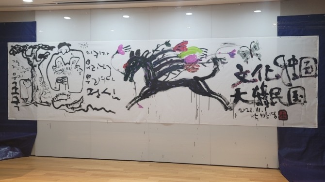 이어 진흥회 '디지갤러리 씨박스' 관장인 박방영 화백의 '문화강국 대한민국'을 써넣은 그림과 (사)한국카툰협회 회장인 조관제 작가의 '지키자 우리나라 우리 정신'을 써넣은 만화가 만난 합동 행위예술 퍼포먼스는 이 날 행사의 의미를 진한 감동으로 새겼다.