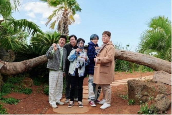공개된 사진 속 '1박 2일 시즌4' 멤버들은 100회를 맞아 제주도로 떠났다. 맏형 연정훈부터 김종민, 문세윤, 딘딘, 막내 라비까지 이국적인 풍광의 야자수와 소철을 배경으로 환한 미소를 짓고 있다.