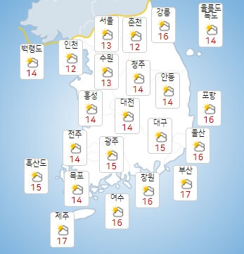 낮 최고기온은 △서울 13도 △대전 14도 △대구 15도 △전주 14도 △광주 15도 △부산 17도 △춘천 12도 △강릉 16도 △제주 18도 △울릉도·독도 14도로 보인다.