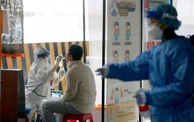 22일 광주 북구 용봉동 선별진료소에서 보건소 의료진이 코로나19 검체를 채취하고 있다. 사진=뉴시스이미지 확대보기