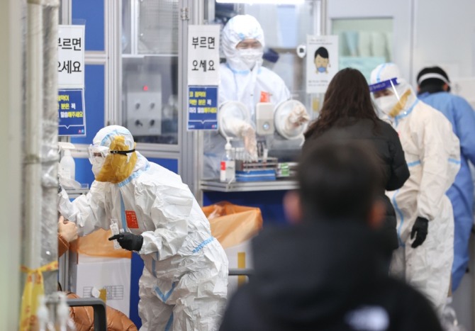 신종 코로나바이러스 감염증(코로나19) 신규 확진자 수가 3928명을 기록한 28일 오전, 서울 송파구보건소 선별진료소에서 의료진이 코로나19 검사 업무를 하고 있다. 사진=연합뉴스
