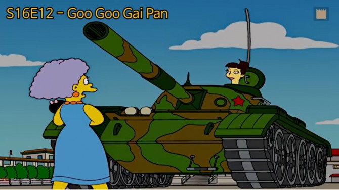 '구구 가이판(Goo Goo Gai Pan)'이라고 불리는 심슨 가족의 사라진 에피소드는 아기를 입양하기 위해 중국으로 날아가는 모습을 보여준다. 미국 만화 가족이 베이징 천안문 광장을 방문하자 "텐안먼 광장: 1989년 여기선 아무 일도 없었음"이라고 적힌 커다란 간판이 등장한다.
