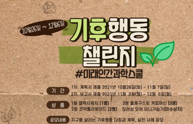 공모전 참여 방법은 지구를 살리는 기후 행동 실천을 위한 다짐 및 계획서를 작성해 1차로 제출하고, 2주 동안 계획에 따라 실천하는 모습을 사진 또는 동영상으로 촬영한 후 보고서로 제출하면 심사를 통해 선정된 수상자에게 상품을 제공할 예정이다.
