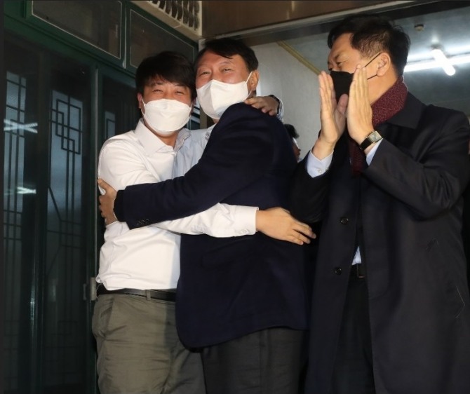 윤 후보와 이 대표는 울산 울주 한 불고깃집에서 열린 만찬 회동을 이었다. 당 대변인은 "국민의 정권교체 열망을 받들어 한치의 흔들림도 없이 일체가 돼 가기로 합의했다"고 말했다.